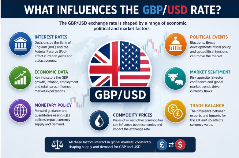 GBP/USD (British pound to US dollar) is affected by interest rates, economic indicators, politics, and market sentiment.
