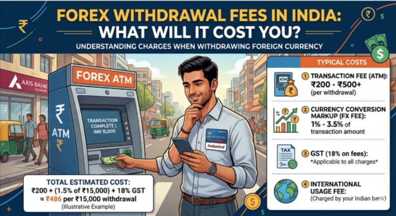 Note the forex withdrawal charges in India, such as conversion and transfer charges.