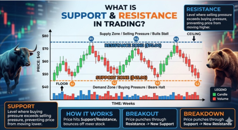 Have you ever gazed at a chart and thought of why the price is continually bouncing off the same spots? This is where support and resistance trading comes in. Simply put, what is support and resistance in trading? It is how traders determine important price areas that markets are likely to turn or stagnate. Be it learning to draw support and resistance forex levels or to perfect your strategy, knowledge of support and resistance levels may turn your trading world upside down.